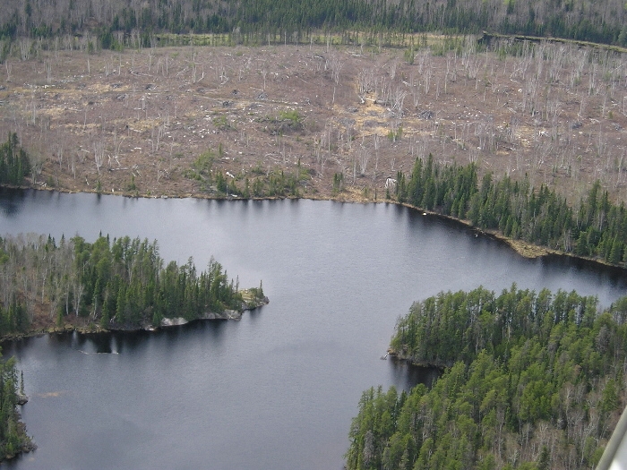 A cut block put in during the winter of 2003. It will be sprayed with herbicides soon. It borders a walleye lake.